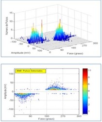 ·         Exibição da taxa de repetição das descargas parciais (pulsos por segundo) versus magnitude (mV), para pulsos positivos e negativos.